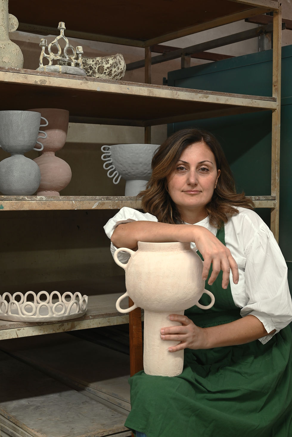 Παρότι σπούδασα γραφιστική, η κεραμική με κέρδισε συνειδητά. Οι σπουδές δίπλα στη Μαρία Καρακατσάνη άνοιξαν τη ματιά μου σε πιο σύγχρονες φόρμες.Καταλυτική, όμως, υπήρξε η δεκαετής συνεργασία με τον εικαστικό Μαρκ Χατζηπατέρα . Δουλεύοντας καθημερινά μαζί του έμαθα να σκέφτομαι με σχέδιο, μέτρο και ακρίβεια. Να σέβομαι τη φόρμα σε κάθε της κλίμακα. Να αποδέχομαι την απώλεια — σπασίματα, λάθη, επαναλήψεις — και να ξαναρχίζω χωρίς φόβο. Εκεί κατάλαβα ότι δεν συνεχίζω απλώς μια παράδοση· χτίζω τη δική μου διαδρομή μέσα σε αυτήν.